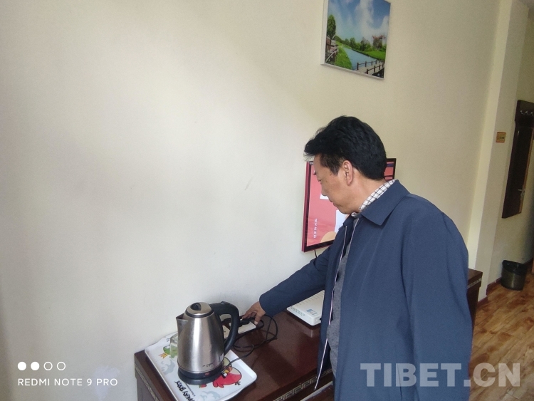 圖為旅客正在尼瑪次仁的家庭旅館內(nèi)使用燒水壺?zé)?/p>