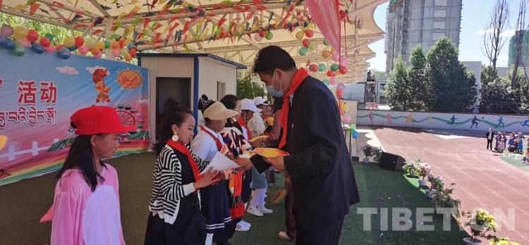 圖為西藏自治區(qū)拉薩市城關(guān)區(qū)納金小學(xué)“童心向黨、做時(shí)代新人”六一兒童節(jié)活動(dòng)現(xiàn)場(chǎng)為優(yōu)秀學(xué)生頒獎(jiǎng)