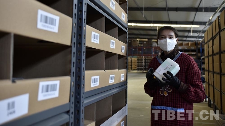 圖為西藏自治區(qū)級公共物流倉儲配送中心里,作業(yè)人員將搬運型機器人“地狼”載來的貨架上的貨物取出