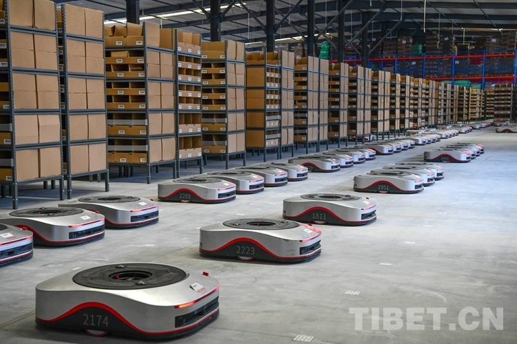圖為西藏自治區(qū)級公共物流倉儲配送中心里,搬運型機器人“地狼”正在工作