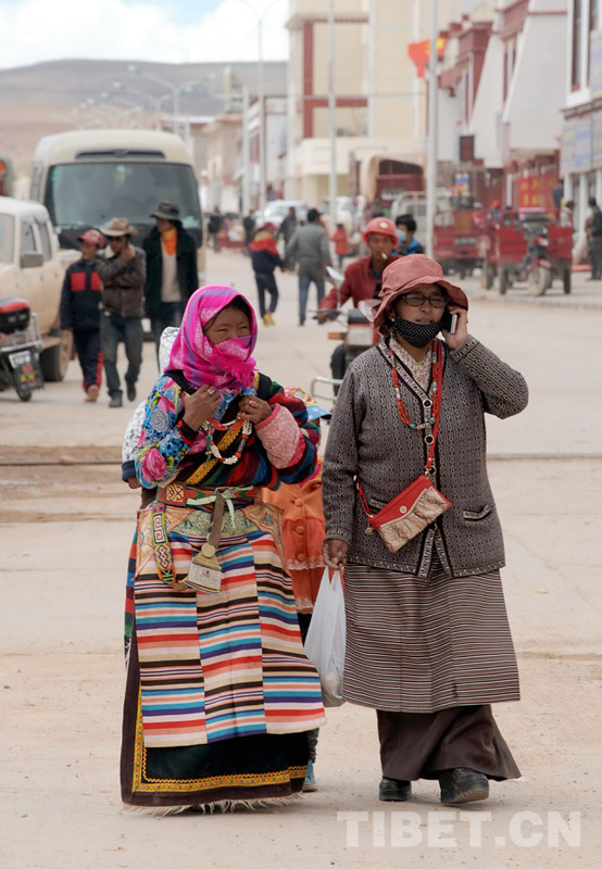 這是尼瑪縣城街頭打著手機逛街的兩位藏族婦女(唐召明2014年7月8日攝)