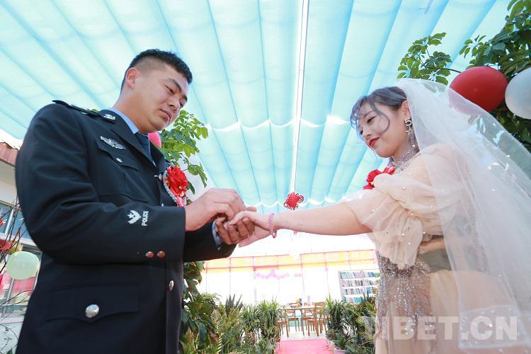 “今天能在警營(yíng)里完成婚禮,非常的激動(dòng)。結(jié)婚是女人一生中最幸福的時(shí)刻,非常感謝單位的領(lǐng)導(dǎo)能給我們這樣的機(jī)會(huì),讓我倆一起度過(guò)人生中最幸福的時(shí)刻。這次的婚禮非常的有意義,將是我們一生中最寶貴的回憶,警營(yíng)讓我成為最美麗的新娘?!毙履锿鯊溺鴾I激動(dòng)地說(shuō)。(中國(guó)西藏網(wǎng) 通訊員/張拴根 記者/王佳豪)