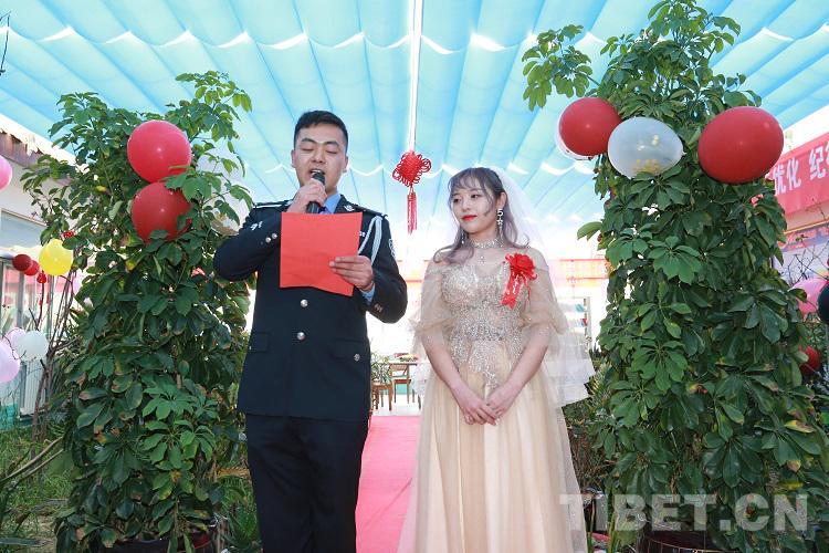 據(jù)了解,郭哲因疫情防控、邊境管控任務(wù)繁重,接到上級(jí)歸隊(duì)通知后,婚禮計(jì)劃被迫取消。阿里邊境管理支隊(duì)黨委得知該情況后,當(dāng)即邀請(qǐng)他們?cè)隈v地舉行婚禮。