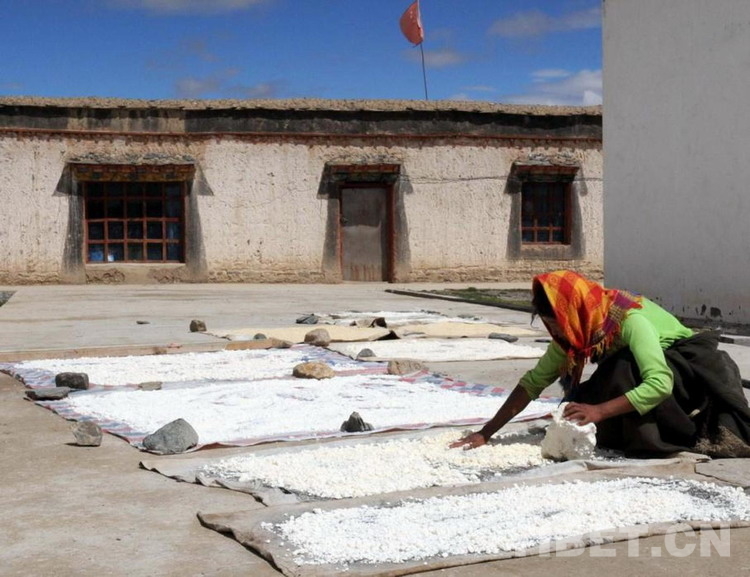 這是一位分工攤曬奶渣的藏族婦女(唐召明2009年攝)