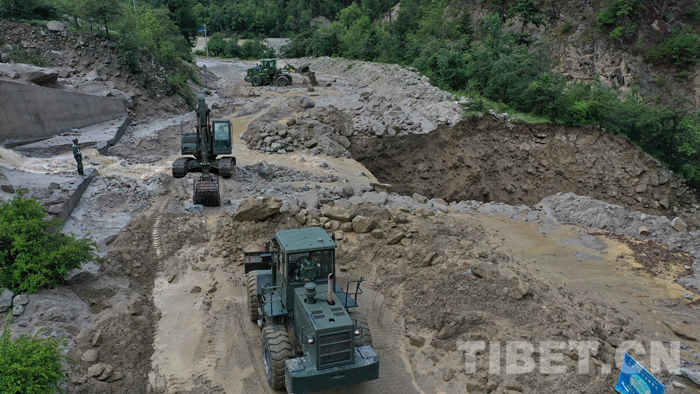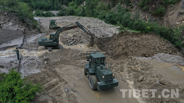 圖為該支隊(duì)救援官兵正在對(duì)川藏線玉普鄉(xiāng)境內(nèi)泥石流進(jìn)行清理