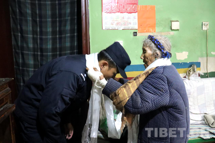 裝完宣傳冊,洛桑旦增又匆忙跑回宿舍,取出早已準備好的慰問物品,驅(qū)車前往上亞東鄉(xiāng)嘎林崗村。洛桑旦增是嘎林崗村的“民警村官”,格桑卓嘎成為他的定點幫扶對象。如今91歲的格桑卓嘠,曾在1965年與丈夫一起參與人民解放軍修筑乃堆拉山口路段的工程,幫助人民解放軍運輸后勤物資和彈藥,丈夫去世后,老奶奶一直獨自生活。