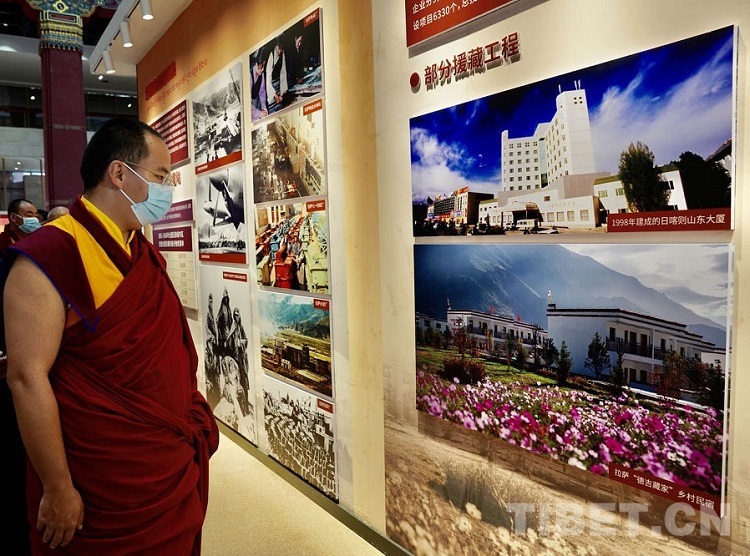 《十七條協(xié)議》簽訂、西藏自治區(qū)第一次人民代表大會召開、習(xí)近平總書記來信、對口援藏資金圖表……一幅幅圖片、一份份史料將西藏和平解放70年來,西藏從黑暗走向光明、從落后走向進步、從貧窮走向富裕、從專制走向民主、從封閉走向開放的歷史生動地呈現(xiàn)出來。班禪不時駐足觀看,詳細詢問有關(guān)情況,對西藏近年來各項事業(yè)取得的成就予以充分肯定。