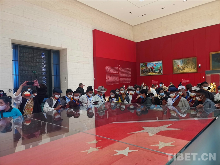 圖為西藏基層干部參觀開(kāi)國(guó)大典上使用過(guò)的五星紅旗 攝影:王茜