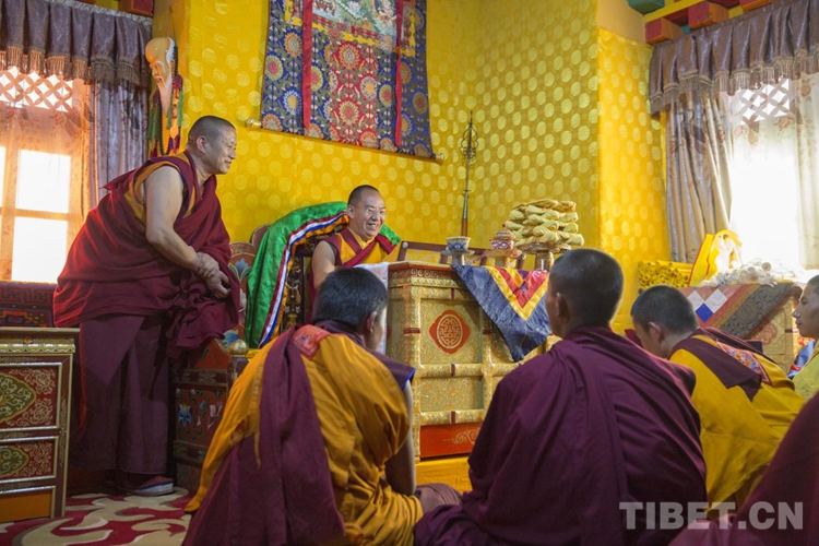 班禪講經(jīng)、禮佛后,在納塘寺主殿二樓一間經(jīng)堂內(nèi)特意現(xiàn)場(chǎng)抽查測(cè)試了年輕僧人對(duì)佛經(jīng)的背誦學(xué)習(xí)情況,聽取四批僧人背誦經(jīng)文,并隨機(jī)提問(wèn)。聽到僧人們對(duì)答如流,班禪頻頻點(diǎn)頭、微笑肯定。