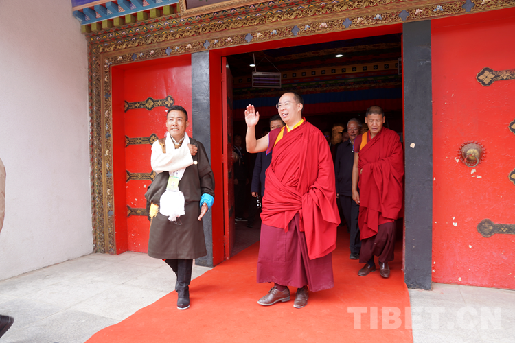 紀念館外,聞訊而來的信教群眾手捧哈達,迎候班禪并恭?!霸鞯吕铡薄0喽U在走進紀念館前后,揮手向群眾回以祝福。