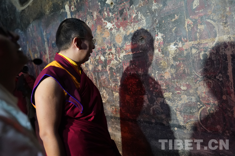 圖為班禪在法王殿內觀摩古老壁畫 攝影:王淑