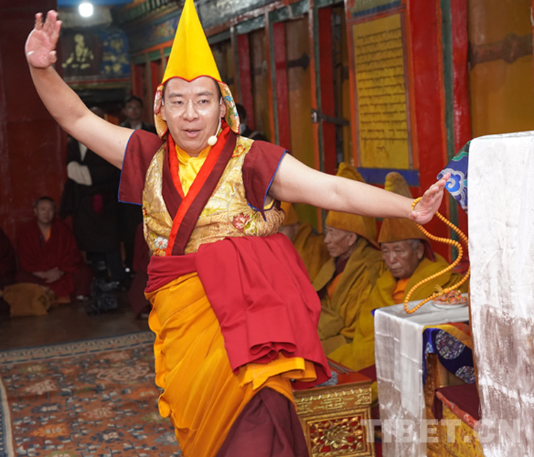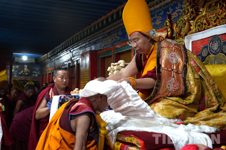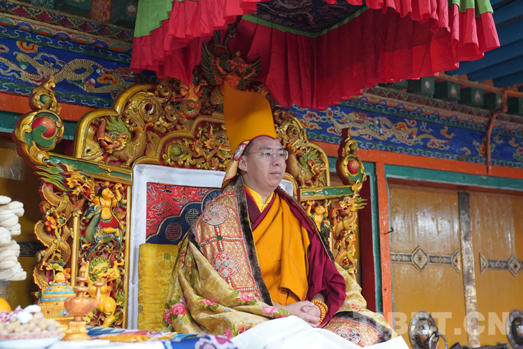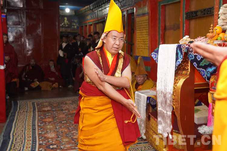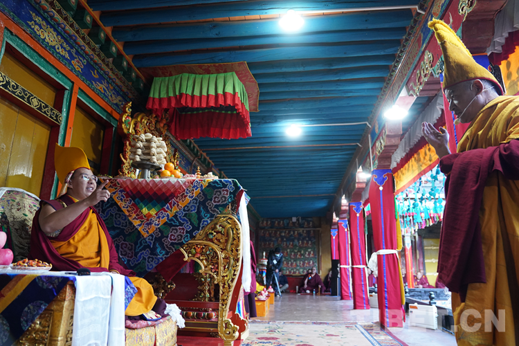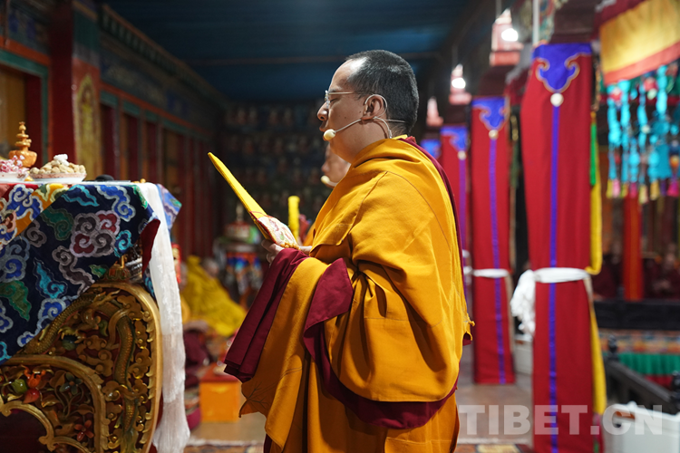 27日(藏歷9月22日),扎什倫布寺舉行祝賀班禪獲得嘎欽學(xué)位吉祥祈愿法會。班禪向在場所有僧眾摸頂賜福,并與僧眾集體誦經(jīng),回向祈福饒益眾生、法務(wù)昌隆、國泰民安、風(fēng)調(diào)雨順。