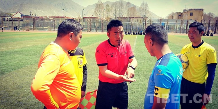 圖為旺堆次仁給即將上場比賽的雙方隊(duì)長強(qiáng)調(diào)規(guī)則 攝影:晉美