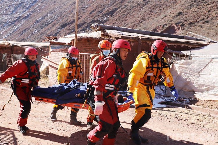 圖為貢覺縣駐防分隊救援人員攜裝匍匐前進