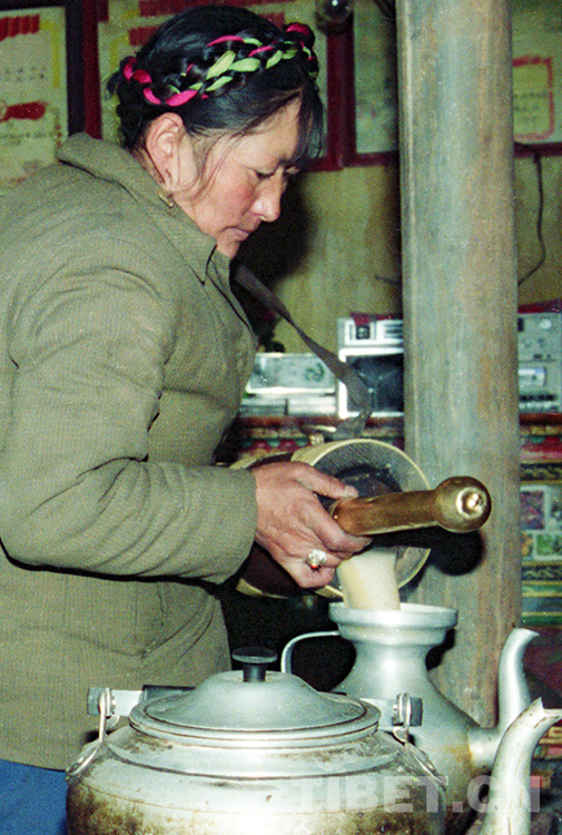 然后,她們又將煮好的濃茶,與酥油一道潷入另一個木制小酥油桶里,雙手握著長長的木塞,打起酥油茶。直到桶內(nèi)聲音從“咣當(dāng)、咣當(dāng)”變成“嚓伊、嚓伊”時,茶、酥油、鹽等即混為一體,酥油茶便打好了。一天所需的酥油茶制作完工后,再去做其它事情……