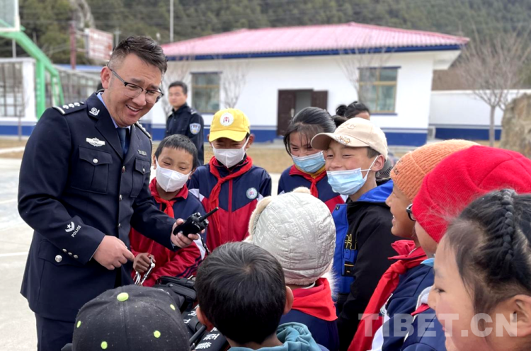 圖為林芝南伊邊境派出所邀請駐地小學生參觀邊境派出所警用裝備 攝影:馬智慧