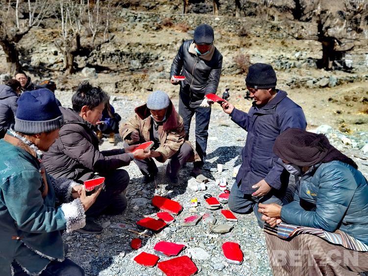 圖為黨員和群眾在柴火旁烤干石頭畫上的顏色