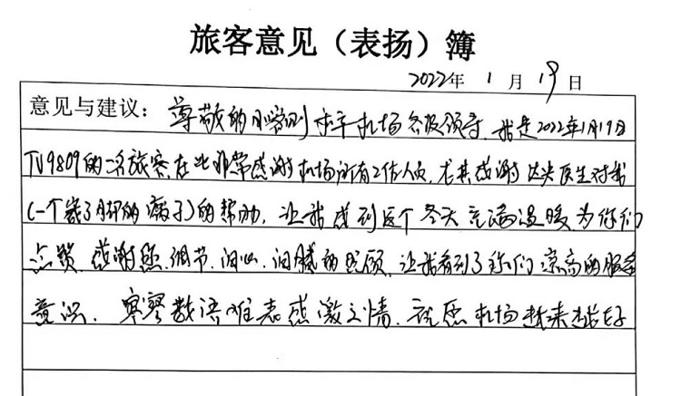 一封感謝信,寥寥數(shù)語(yǔ)表達(dá)了旅客對(duì)機(jī)場(chǎng)服務(wù)工作的理解和美好祝愿,繁忙的春運(yùn)工作在冬日里多了一點(diǎn)溫度。