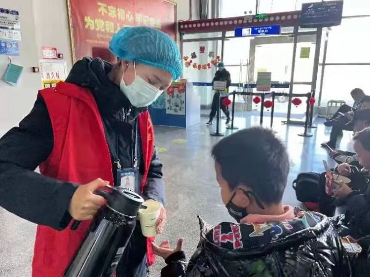 圖為日喀則航站志愿者為旅客倒熱水