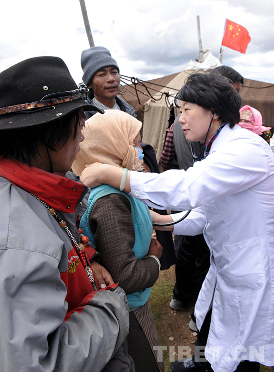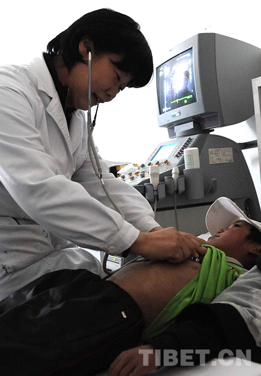 這是北京安貞醫(yī)院醫(yī)生顧虹在當(dāng)雄縣納木錯鄉(xiāng)為牧民群眾進(jìn)行先天性心臟病篩查(唐召明2012年7月29日攝)