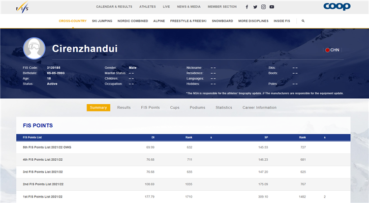 圖為國(guó)際雪聯(lián)官網(wǎng)運(yùn)動(dòng)員次仁占堆介紹