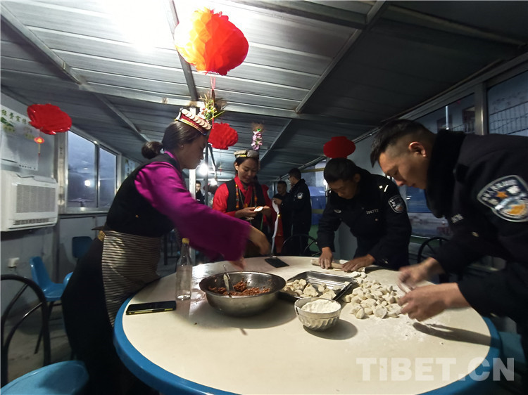 “阿久(藏語(yǔ)音譯:大叔),包餃子得講究手法,你要把餡放皮中央?!泵窬悋?guó)云邊講解邊演示,一個(gè)個(gè)餃子范本整整齊齊擺在托盤上。香腸、臘肉、餃子、羊肉、雞湯、糌粑、火鍋.....一桌藏漢式的年夜飯準(zhǔn)備完畢,大家圍坐在圓桌旁,舉杯共祝新春,濃濃的年味兒在夏爾巴第一村溢出,教導(dǎo)員康林感嘆道:“雖然春節(jié)不能回家,但是我們就是一個(gè)大家,祝大家新年快樂(lè),扎西德勒!”