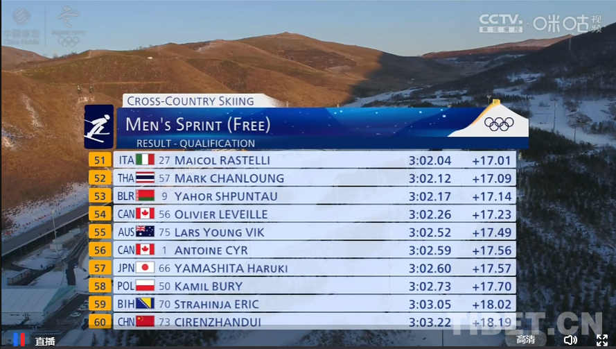 圖為北京冬奧會(huì)越野滑雪個(gè)人短距離(自由技術(shù))資格賽成績(jī)