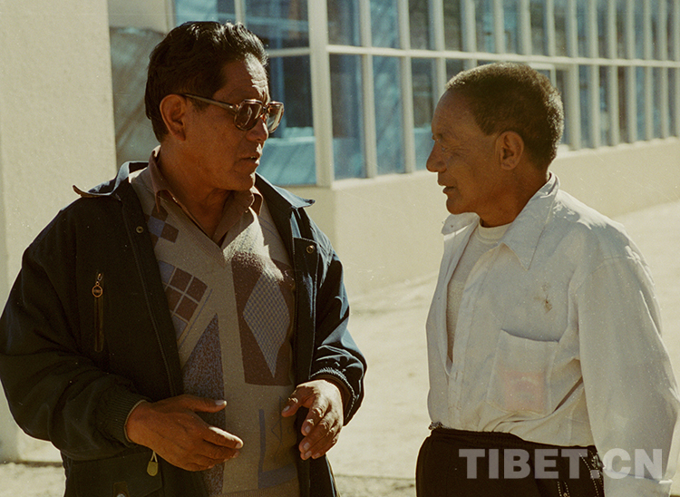 這是原雙湖辦事處首任書(shū)記,后任那曲地委(現(xiàn)那曲市)書(shū)記、西藏人大常委會(huì)副主任等職的洛桑丹珍(左)在申扎縣調(diào)研時(shí)與當(dāng)?shù)乩细刹窟M(jìn)行交流(唐召明2001年攝)