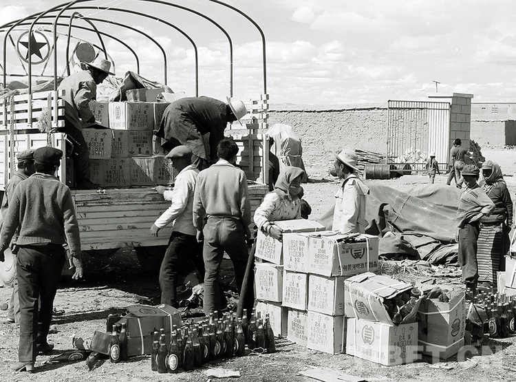 這是雙湖辦事處(現(xiàn)雙湖縣)貿(mào)易公司人員正在卸車,這些啤酒等食品飲料均由雙湖西亞爾公司組織貨源運(yùn)輸而來(lái)(唐召明1987年攝)