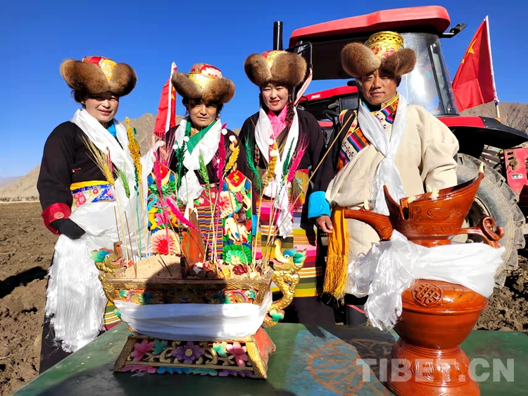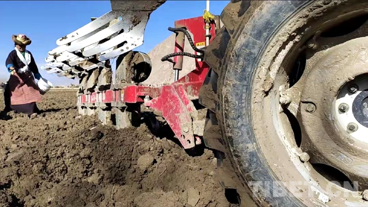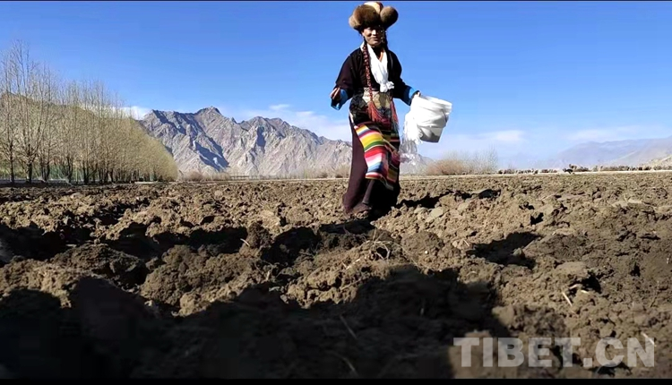 在雪水浸潤過的肥沃土地上,深耕機車輪翻滾而過,駛過的土地上翻起深色的泥土,婦女們跟在后面播撒青稞良種。現(xiàn)場一片轟鳴,熱鬧無比,廣袤、肥沃的土地上播種下了春天的希望。