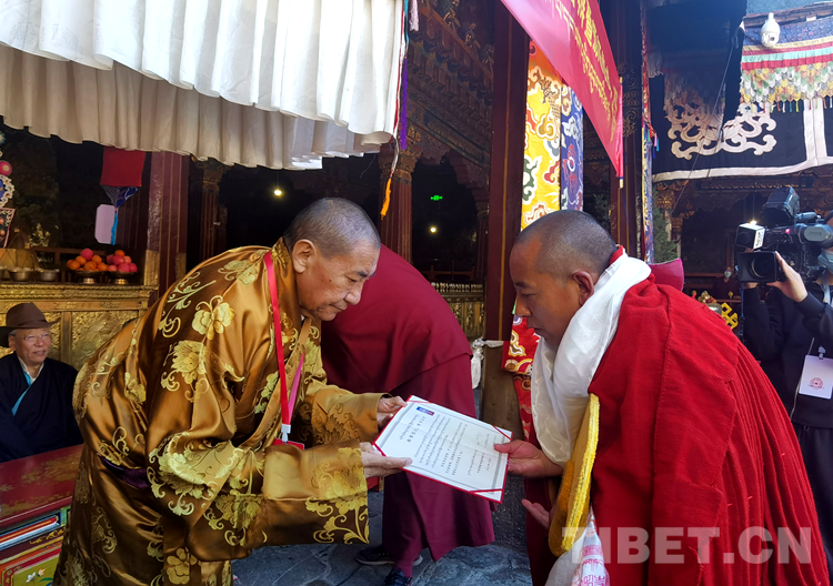 圖為中國佛教協(xié)會西藏分會常務(wù)副會長珠康·土登克珠活佛(左)向考僧頒發(fā)學(xué)位證書 攝影:王淑