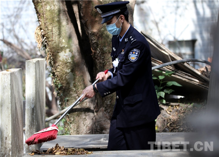 圖為民警清掃烈士墓碑上面的樹葉 攝影:鄒興國