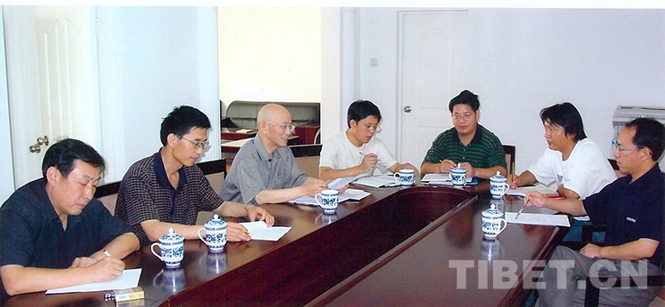 圖為陳慶英先生(左3)主持中國藏學(xué)研究中心歷史研究所會(huì)議,討論《西藏通史》相關(guān)工作 (圖片由張?jiān)铺峁?/p>