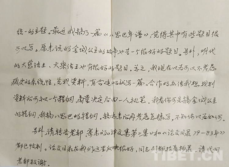 記得我大學(xué)畢業(yè)剛到新單位,人生地不熟,加之原來沉浸在“文學(xué)夢”中,現(xiàn)在陡然轉(zhuǎn)到藏族歷史研究,所謂基礎(chǔ)不牢地動(dòng)山搖,困惑加不適,可想而知。陳老師在聊天中得知我的情況后,談到文史不分家,自己對文學(xué)也很有興趣,與青海《瀚海潮》編輯很熟悉。這樣,我遇到一個(gè)學(xué)識(shí)淵博的良師益友,聆聽指教,何其難得。在陳老師的鼓勵(lì)和幫助下,我在惶惑中嘗試把歷史與文學(xué)結(jié)合起來,與他合作發(fā)表了歷史故事新編《長安和親》《香波山奇遇—吐蕃聶墀贊普的故事》等,平穩(wěn)地完成了專業(yè)變動(dòng)的過渡期。后來,他離開中央民族學(xué)院到青海社會(huì)科學(xué)院工作,我們之間仍堅(jiān)持信件往來,得到他很多幫助。每一次通信,我們談得最多的都是學(xué)術(shù)。在某次回信中,他談及下一步合作的工作,特別提到“至于今后如何搞,我想原來定的歷史故事新編計(jì)劃似乎是太大了一點(diǎn)。主要從藏族史的系統(tǒng)性考慮,而沒有考慮到現(xiàn)實(shí)的需要。所以我想還是先寫主題符合現(xiàn)實(shí)需要的題目,寫歌頌民族團(tuán)結(jié)、文化交流,國家統(tǒng)一的主題。最近,我搞了一篇《八思巴年譜》,覺得其中有些題目很可以寫。原來說的金城公主的故事也是一個(gè)很好的題目。另外,明代的大慈法王、大乘法王也有很好的題目??傊?,我現(xiàn)在認(rèn)為可以不考慮藏族史的系統(tǒng)性,先找資料,有合適的就寫一篇。合作的辦法我想找到資料后,可擬一個(gè)提綱,商量決定后,由一人執(zhí)筆。我看你可先搞金城公主的提綱,我搞八思巴的提綱,搞出來后再考慮怎樣寫,不知你以為如何?!?/p>