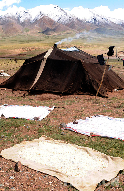 在藏北草原,夏天是牦牛產(chǎn)奶旺季,牧民此時吃奶類食物比別的季節(jié)多。喝的奶大多是牦牛奶,其次為綿羊奶和山羊奶。人們既喝鮮奶,也喝酸奶、吃奶渣。奶渣大多是拌糌粑時食用。