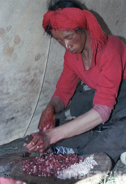 這是班戈縣的一位青年牧民在帳篷里切剁羊肉,準備灌制肉腸(唐召明1987年攝)