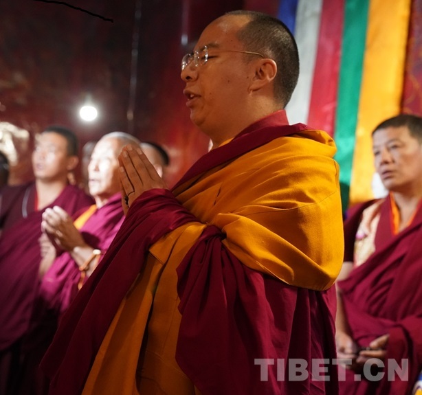 法號齊鳴、法鑼合奏,眾僧以隆重的宗教儀軌迎接班禪。班禪抵達藏傳佛教格魯派祖寺甘丹寺后在僧眾的簇擁下,先后步入羊堅多康殿、宗喀巴大師靈塔殿、十八羅漢殿朝拜、誦經、敬獻哈達。