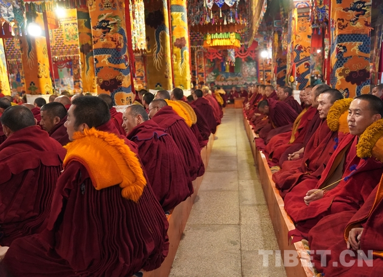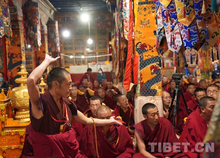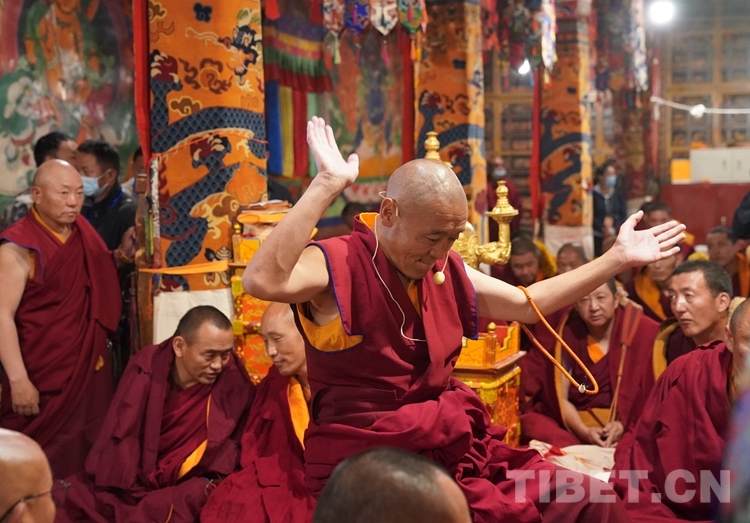 朝拜結束后,班禪步入甘丹寺夏孜扎倉,現(xiàn)場觀摩2023年度西藏自治區(qū)藏傳佛教學經僧人晉升格西拉讓巴學位夏季預考活動。