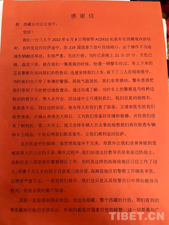 原來,在今年6月8日晚,一輛私家車在經(jīng)過阿里地區(qū)馬攸木拉達(dá)坂下坡路段時,因操作失誤駛出路面發(fā)生側(cè)翻,車損嚴(yán)重,無法繼續(xù)行駛,車上3名游客被困兩個多小時。21時30分許,到附近縣城參會返回單位的馬攸橋邊境檢查站幾位民警在路上發(fā)現(xiàn)了這一情況,便立即開展救援工作。據(jù)當(dāng)時參與救援的馬攸橋邊境檢查站教導(dǎo)員劉紅回憶到,當(dāng)時氣溫低至零下五六度。在詢問完3名游客傷勢后,民警們便立即安排警車將游客送至檢查站,并留下3位民警在現(xiàn)場值守,以防二次事故發(fā)生。
