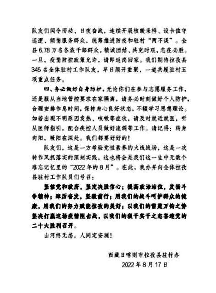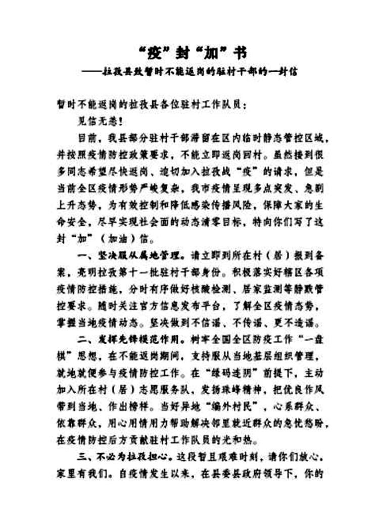 圖為西藏日喀則市拉孜縣駐村辦下發(fā)給無法返崗的駐村干部的一封信——“疫”封“加”書