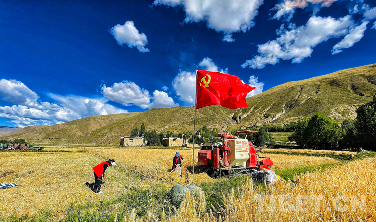 圖為瓊結(jié)縣拉玉鄉(xiāng)黨員志愿先鋒隊在該鄉(xiāng)強吉村二組幫助村民收青稞。多吉攝
