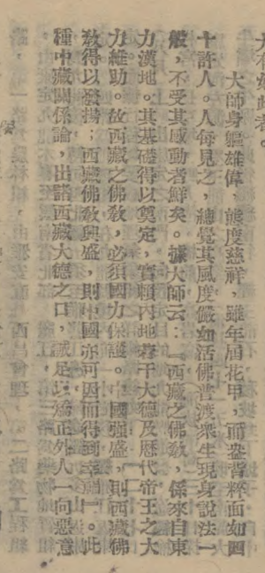 次年,應(yīng)重慶漢藏教理院和成都佛學(xué)社的邀請,東本格西決定前往當(dāng)?shù)刂v法。期間,日本空襲不斷,拉薩官民與弟子因憂慮東本格西安危,力勸其勿前往。但是,東本格西從佛教利益世間的角度出發(fā),認(rèn)為在當(dāng)?shù)孛癖娍嚯y之際,作為僧人更應(yīng)不懼危險,前往當(dāng)?shù)匚拷迕癖?,以紓解?zhàn)爭造成的創(chuàng)傷與苦痛。1943年1月,東本格西從拉薩啟程前往理化(今理塘),參加九世班禪靈童尋訪測驗事宜。4月,經(jīng)由康定抵達成都,沿途受到各地政府官員與僧俗弟子的歡迎。東本格西應(yīng)中國邊疆問題研究會邀請講演“佛教與邊疆”,蒙藏委員會委員格桑澤仁翻譯。[3]講演內(nèi)容主要分為三部分:首先,詳細(xì)敘述藏傳佛教發(fā)展演變的歷史,提出因于歷代高僧與中央政府的大力維護與資助,藏傳佛教發(fā)展的基礎(chǔ)才得以奠定;其次,分析邊疆佛教的分布與信仰狀況;最后,分析佛教與邊疆的關(guān)系。[4]他在講到佛教昌盛與國家實力發(fā)展之間的關(guān)系時,明確提出“西藏之佛教,必須國力保護,中國強盛,則藏傳佛教得以發(fā)揚,藏傳佛教興盛,則中國亦可因而得到幸?!盵5]。東本格西從歷史和現(xiàn)實角度詮釋西藏作為中華民族共同家園的角色,邊疆不惟具體的地理概念和信仰文化差異的標(biāo)簽,而是中央政府長期支持發(fā)展的歷史凝結(jié),是中華民族共同家園的一分子。