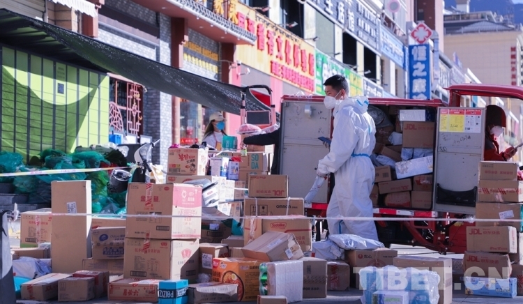 中國西藏網(wǎng)訊 隨著拉薩市疫情防控形勢整體持續(xù)向好,目前拉薩市郵政快遞業(yè)在落實好常態(tài)化疫情防控工作的基礎上,正有序復工復產(chǎn)。圖為快遞員無接觸配送快遞 攝影:賈華加(中國西藏網(wǎng) 記者/賈華加)