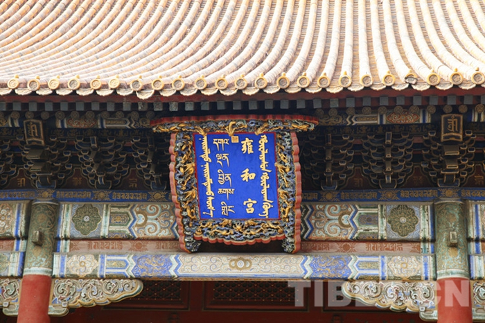 圖為雍和宮大殿匾額,從右至左,以滿文、漢文、藏文、蒙古文書(shū)寫(xiě)“雍和宮” 攝影:李元梅