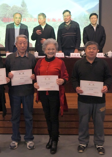 這是霍鐘權(quán)、盛瑞玲、李業(yè)壯(前排從左至右)在北京建藏援藏工作者協(xié)會代表大會上受到表彰(唐召明2019年1月26日攝)