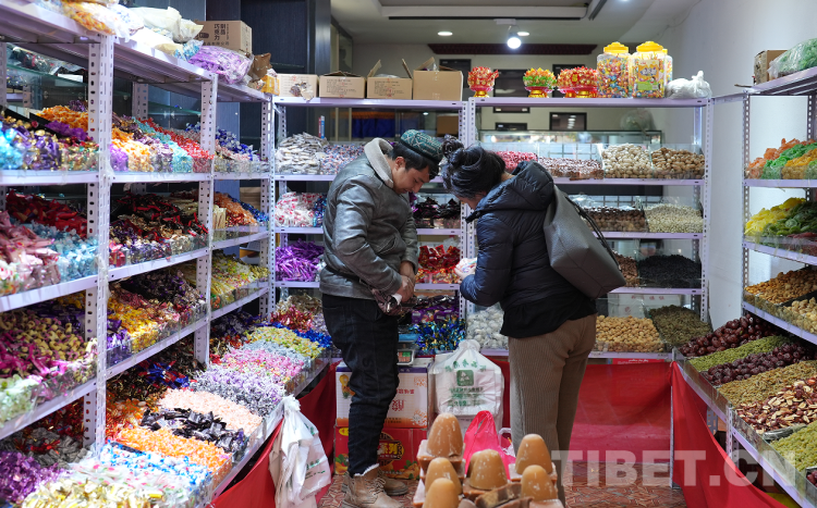 在八廓商城附近的一家門店里,來自新疆當(dāng)?shù)氐暮吞锎髼棥⑻焐缴硹?、葉城核桃、大白杏干、馬奶子葡萄干、天山烏梅、巴旦木等,因食材地道、品質(zhì)優(yōu)良格外受到拉薩市民的青睞。老板是位“00”后維吾爾族青年,頭腦靈活,待人熱情,近日來持續(xù)火爆的生意更是讓他高興得合不攏嘴。上門購物的顧客有藏族、漢族、回族等民族,他們除了購買地道的新疆干果,還會購買該店專為藏歷新年新上的大白兔奶糖、彩色硬質(zhì)水果糖、果汁軟糖、巧克力、棒棒糖、藏式奶渣等貨品。人們用漢語加手勢比劃著交流,溝通無礙,再加上移動支付方便快捷,老板誠信經(jīng)營,顧客們總能高興而來,滿意而歸。