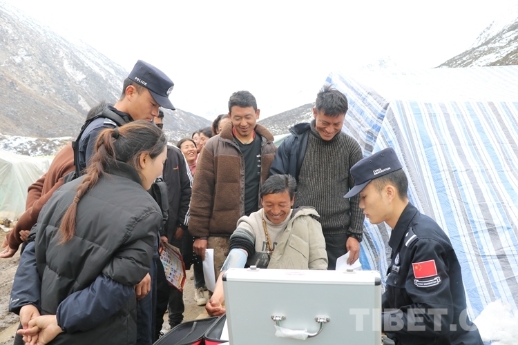 圖為林芝臥龍邊境派出所民警龍俊吉在蟲(chóng)草采挖區(qū)幫助群眾測(cè)量血壓 攝影:沈朋