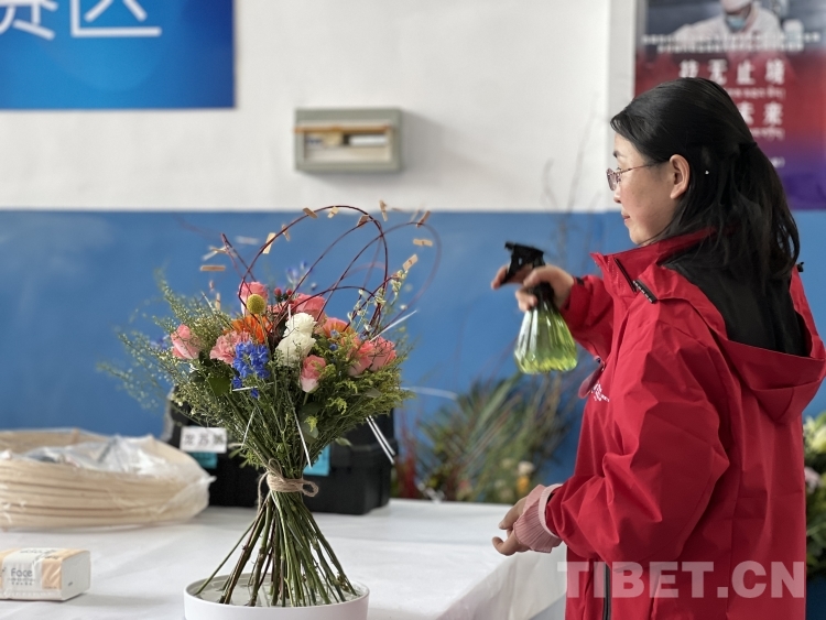 圖為林芝市職業(yè)技術(shù)學(xué)校職工組選手龍?zhí)K娟對(duì)自己的花藝作品進(jìn)行噴水保鮮 攝影:德吉卓瑪