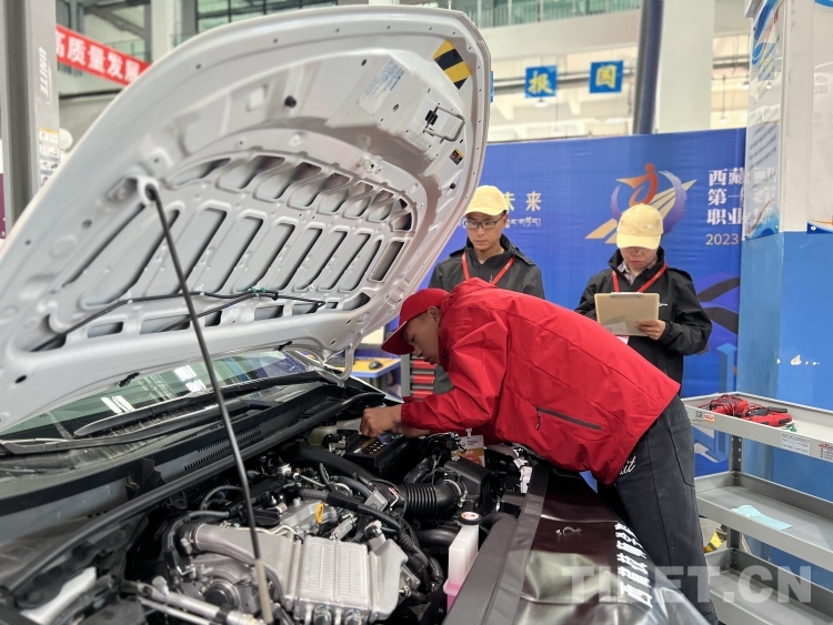 圖為參賽選手進(jìn)行汽車(chē)維修項(xiàng)目比賽 攝影:德吉卓瑪