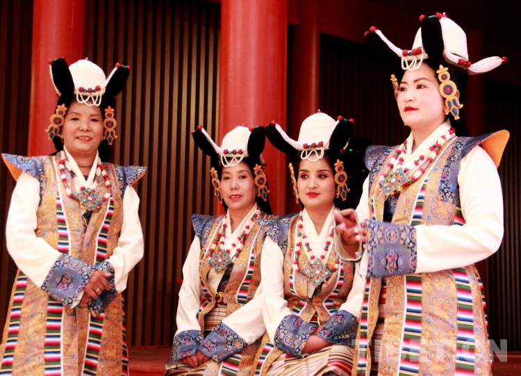圖為拉薩市城關(guān)區(qū)娘熱民間藝術(shù)團演員表演國家級非物質(zhì)文化遺產(chǎn)“嘎爾”攝影:劉莉